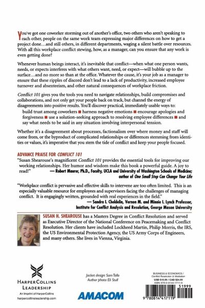 Learn how conflict is created, how to respond to it, and how to manage it more effectively so that your team can get back to doing what it does best: producing top results for your organization. From mild disagreements to major personnel blowouts, conflict in the workplace is unavoidable. Conflict 101 employs research, humor, and relatable anecdotes to help readers more deeply understand: what it takes to build trust, harness negative emotions, encourage apologies and forgiveness, use a solution-seeking approach, and say what needs to be said in the workplace to move past conflicts. Whether it's a fight over resources, a disagreement about how to get things done, or an argument stemming from perceived differences in identities or values, the manager's role is to navigate relationships, build compromises, and encourage better collaboration. In doing so, you'll not only become a stronger manager--you'll build a much stronger team.