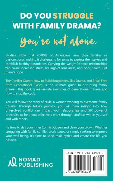 Do you struggle with family drama? You're not alone. Studies reveal that 70-80% of Americans view their families as dysfunctional, making it challenging for some to communicate their needs and establish boundaries. Unfortunately, carrying the weight of broken family bonds can cause increased stress, feelings of loneliness, and poor health. But there is hope. The Conflict Queen: How to Build Boundaries, Slay Drama, and Break Free from Generational Cycles, is the ultimate guide to breaking free from the cycle of dysfunction. Through the story of Nikki, a woman working to overcome generational trauma and toxic family cycles, you'll gain insight into how unresolved conflict can impact your life and relationships. This powerful book provides practical strategies, real-life examples, and exercises that equip readers with the tools and techniques to build boundaries, communicate effectively, and form healthy bonds. In this book, you will learn:Types of conflicts and how they can show up in families How to identify your communication style The power of emotional intelligence How to stop gossip in its tracks The benefits of empowering your inner child The Six Principles of Conflict Resolution The P.I.C.H. Method to Slay Conflict And, six powerful exercises to connect with your inner voice and identify habits Don't let toxic family dynamics and generational cycles hold you back. Whether you're struggling with family conflict, work issues, or simply seeking to improve your emotional well-being, it's time to claim your crown and build the life you deserve.