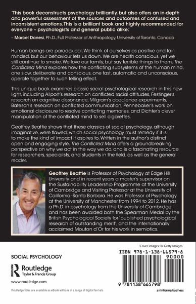 One of the greatest paradoxes of human behavior is our tendency to say one thing and do something completely different. We think of ourselves as positive and fair-minded, caring about other people and our environment, yet our behavior lets us down time and time again. Part of the reason for this is that we may have two separate 'selves': two separate and dissociated mental systems - one conscious, reflective and rational, and one whose motives and instincts are rooted in the unconscious and whose operation resists reflection, no matter how hard we try.¿ In all kinds of areas of our life - love, politics, race, smoking, survival - one system seems to make very different sorts of judgements to the other, and is subject to distinct, hidden biases.¿ The Conflicted Mind explores how and why this system operates as it does and how we may use that knowledge to promote positive behaviour change.¿ However, the 'conflicted mind' is a broader concept than just the clash between potential (hypothetical) systems of thinking, because in one form or another it forms the very pillars on which the edifice of social psychology is built.¿This unique book therefore examines key social psychology theories and research in a new light, including Festinger's concept of cognitive dissonance, Milgram's obedience experiments, Bateson's description of conflict in communications, and Bartlett's explorations of the constructive nature of human memory. Geoffrey Beattie argues that although these classic studies were sometimes great and imaginative beginnings, they were also full of flaws, which social psychology must remedy if it is to make the kind of impact it aspires to. In doing so, he offers a ground breaking perspective on why we think and act in the way we do, to see what lessons can be learned for the discipline of social psychology going forward. Written in the author's distinct open and engaging style, The Conflicted Mind is a fascinating resource for researchers, specialists, and students in the field, as well as the general reader.
