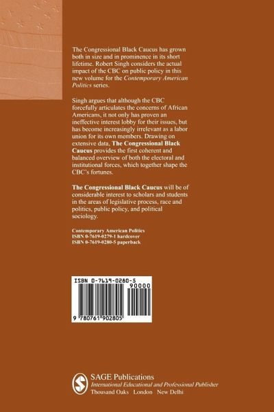 The Congressional Black Caucus has grown both in size and in prominence in its short lifetime. Robert Singh considers the actual impact of the CBC on public policy in this new volume for the Contemporary American Politics series. Singh argues that while the CBC forcefully articulates the concerns of African Americans, it has not only proven an ineffective interest lobby for their issues, but has become increasingly irrelevant as a labor union for its own members. Drawing on extensive data, The Congressional Black Caucus provides the first coherent and balanced overview of both the electoral and institutional forces, which together shape the CBCÆs fortunes. The Congressional Black Caucus will be of considerable interest to scholars and students in the areas of legislative process, race and politics, public policy, and political sociology.