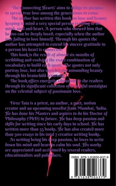 'The Connecting Hearts' aims to oblige its purpose to spread true love among the generations to come. The author has written this book on love and beauty keeping in mind a very special person residing in his mind, soul and heart. A person who showed him that he too can be deeply loved, especially when the author was failing to love himself. Through his quotes the author has attempted to extend his sincere gratitude to a person his heart is connected. This book is the result of almost six months of scribbling and evolving the exact combination of vocabulary to build each quote. The quotes not only portray love, but also sketches the astounding beauty through his brainchild creations. The book offers energetic vibrations to the readers through its significant collection of beautiful nostalgias on the celestial subject of passionate love.