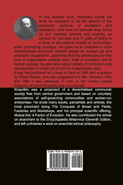 In this work, Kropotkin points out what he considers to be the defects of the economic systems of feudalism and capitalism, and how he believes they thrive on and maintain poverty and scarcity, as symbol for richness and in spite of being in a time of abundance thanks to technology, while promoting privilege. He goes on to propose a more decentralised economic system based on mutual aid and voluntary cooperation, asserting that the tendencies for this kind of organisation already exist, both in evolution and in human society. He also talks about details of revolution and expropriation in order not to end in a reactionary way.