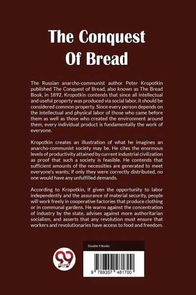 The Russian anarcho-communist author Peter Kropotkin published The Conquest of Bread, also known as The Bread Book, in 1892. Kropotkin contends that since all intellectual and useful property was produced via social labor, it should be considered common property. Since every person depends on the intellectual and physical labor of those who came before them as well as those who created the environment around them, every individual product is fundamentally the work of everyone. Kropotkin creates an illustration of what he imagines an anarcho-communist society may be. He cites the enormous levels of productivity attained by current industrial civilization as proof that such a society is feasible. He contends that sufficient amounts of the necessities are generated to meet everyone's wants; if only they were correctly distributed, no one would have any unfulfilled demands. According to Kropotkin, if given the opportunity to labor independently and the assurance of material security, people will work freely in cooperative factories that produce clothing or in communal gardens. He warns against the concentration of industry by the state, advises against more authoritarian socialism, and asserts that any revolution must ensure that workers and revolutionaries have access to food and freedom.