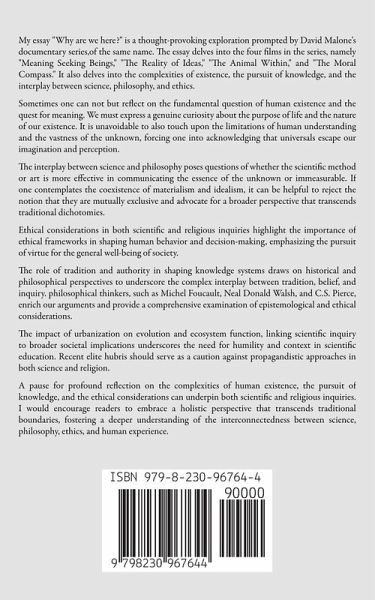 My essay "Why are we here?" is a thought-provoking exploration prompted by David Malone's documentary series,of the same name. The essay delves into the four films in the series, namely "Meaning Seeking Beings," "The Reality of Ideas," "The Animal Within," and "The Moral Compass." It also delves into the complexities of existence, the pursuit of knowledge, and the interplay between science, philosophy, and ethics. Sometimes one can not but reflect on the fundamental question of human existence and the quest for meaning. We must express a genuine curiosity about the purpose of life and the nature of our existence. It is unavoidable to also touch upon the limitations of human understanding and the vastness of the unknown, forcing one into acknowledging that universals escape our imagination and perception. The interplay between science and philosophy poses questions of whether the scientific method or art is more effective in communicating the essence of the unknown or immeasurable. If one contemplates the coexistence of materialism and idealism, it can be helpful to reject the notion that they are mutually exclusive and advocate for a broader perspective that transcends traditional dichotomies. Ethical considerations in both scientific and religious inquiries highlight the importance of ethical frameworks in shaping human behavior and decision-making, emphasizing the pursuit of virtue for the general well-being of society. The role of tradition and authority in shaping knowledge systems draws on historical and philosophical perspectives to underscore the complex interplay between tradition, belief, and inquiry. philosophical thinkers, such as Michel Foucault, Neal Donald Walsh, and C.S. Pierce, enrich our arguments and provide a comprehensive examination of epistemological and ethical considerations. The impact of urbanization on evolution and ecosystem function, linking scientific inquiry to broader societal implications underscores the need for humility and context in scientific education. Recent elite hubris should serve as a caution against propagandistic approaches in both science and religion. A pause for profound reflection on the complexities of human existence, the pursuit of knowledge, and the ethical considerations can underpin both scientific and religious inquiries. I would encourage readers to embrace a holistic perspective that transcends traditional boundaries, fostering a deeper understanding of the interconnectedness between science, philosophy, ethics, and human experience.