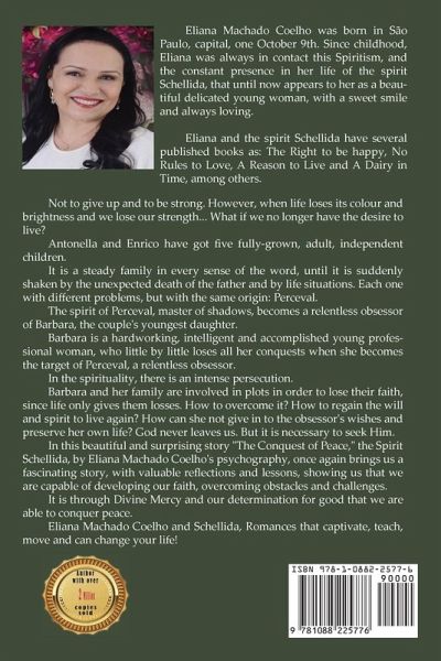 Not to give up and to be strong. However, when life loses its colour and brightness and we lose our strength... What if we no longer have the desire to live? Antonella and Enrico have got five fully-grown, adult, independent children. It is a steady family in every sense of the word, until it is suddenly shaken by the unexpected death of the father and by life situations. Each one with different problems, but with the same origin: Perceval. The spirit of Perceval, master of shadows, becomes a relentless obsessor of Barbara, the couple's youngest daughter. Barbara is a hardworking, intelligent and accomplished young professional woman, who little by little loses all her conquests when she becomes the target of Perceval, a relentless obsessor. In the spirituality, there is an intense persecution. Barbara and her family are involved in plots in order to lose their faith, since life only gives them losses. How to overcome it? How to regain the will and spirit to live again? How can she not give in to the obsessor's wishes and preserve her own life? God never leaves us. But it is necessary to seek Him. In this beautiful and surprising story "The Conquest of Peace," the Spirit Schellida, by Eliana Machado Coelho's psychography, once again brings us a fascinating story, with valuable reflections and lessons, showing us that we are capable of developing our faith, overcoming obstacles and challenges. It is through Divine Mercy and our determination for good that we are able to conquer peace. Eliana Machado Coelho and Schellida, Romances that captivate, teach, move and can change your life!