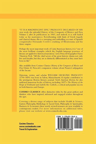 "It is a magnificent epic," Prescott declared of his own work, the splendid History of the Conquest of Mexico, after its publication in 1843, and indeed, it is still hailed today as his masterpiece. Reverberating with hints of Greek tragedy and classical drama, this is a sweeping and enthralling account of Spanish conquistador Hernando Cortés's crushing of Montezuma and his Aztec empire. Perhaps the most important work of Latin American history, it is "one of the most brilliant examples which the English language possesses of literary art applied to historical narration," raves Prescott biographer Harry Thurston Peck. "All the chief actors of his great historic drama not only live and breathe, but they are as distinctly differentiated as they must have been in life." Also available from Cosimo Classics: History of the Conquest of Peru, Prescott's companion volume about Pizarro's subjugation of the Incans. Historian, writer, and scholar WILLIAM HICKLING PRESCOTT (1796-1859) was born in Salem, Massachusetts. A regular contributor to the prestigious Boston literary journal North American Review, he also authored numerous books of history, including 1837's The History of the Reign of Ferdinand and Isabella the Catholic, a critical and popular success in both America and Europe.