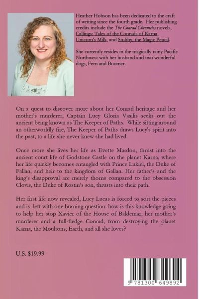 This book is number 6 in the Conrad Chronicles series. On a quest to discover more about her Conrad heritage and her mother's murderer, Captain Lucy Gloria Vasilis seeks out the ancient being known as The Keeper of Paths. While sitting around an otherworldly fire, The Keeper of Paths draws Lucy's spirit into the past, to a life she never knew she had lived. Once more she lives her life as Evette Mardon, thrust into the ancient court life of Godstone Castle on the planet Karna, where her life quickly becomes entangled with Prince Lukiel, the Duke of Fallan, and heir to the kingdom of Gallan. Her father's and the king's disapproval are merely thorns compared to the obsession Clovis, the Duke of Rostin's son, thrusts into their path. Her first life now revealed, Lucy Lucas is forced to sort the pieces and is left with one burning question: how is this knowledge going to help her stop Xavier of the House of Baldemar, her mother's murderer and a full-fledge Conrad, from destroying the planet Karna, the Moultons, Earth, and all she loves?