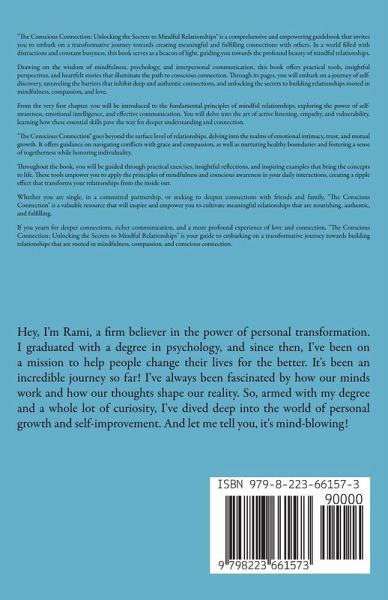 "The Conscious Connection: Unlocking the Secrets to Mindful Relationships" is a comprehensive and empowering guidebook that invites you to embark on a transformative journey towards creating meaningful and fulfilling connections with others. In a world filled with distractions and constant busyness, this book serves as a beacon of light, guiding you towards the profound beauty of mindful relationships. Drawing on the wisdom of mindfulness, psychology, and interpersonal communication, this book offers practical tools, insightful perspectives, and heartfelt stories that illuminate the path to conscious connection. Through its pages, you will embark on a journey of self-discovery, unraveling the barriers that inhibit deep and authentic connections, and unlocking the secrets to building relationships rooted in mindfulness, compassion, and love. From the very first chapter, you will be introduced to the fundamental principles of mindful relationships, exploring the power of self-awareness, emotional intelligence, and effective communication. You will delve into the art of active listening, empathy, and vulnerability, learning how these essential skills pave the way for deeper understanding and connection. "The Conscious Connection" goes beyond the surface level of relationships, delving into the realms of emotional intimacy, trust, and mutual growth. It offers guidance on navigating conflicts with grace and compassion, as well as nurturing healthy boundaries and fostering a sense of togetherness while honoring individuality. Throughout the book, you will be guided through practical exercises, insightful reflections, and inspiring examples that bring the concepts to life. These tools empower you to apply the principles of mindfulness and conscious awareness in your daily interactions, creating a ripple effect that transforms your relationships from the inside out. Whether you are single, in a committed partnership, or seeking to deepen connections with friends and family, "The Conscious Connection" is a valuable resource that will inspire and empower you to cultivate meaningful relationships that are nourishing, authentic, and fulfilling. If you yearn for deeper connections, richer communication, and a more profound experience of love and connection, "The Conscious Connection: Unlocking the Secrets to Mindful Relationships" is your guide to embarking on a transformative journey towards building relationships that are rooted in mindfulness, compassion, and conscious connection.