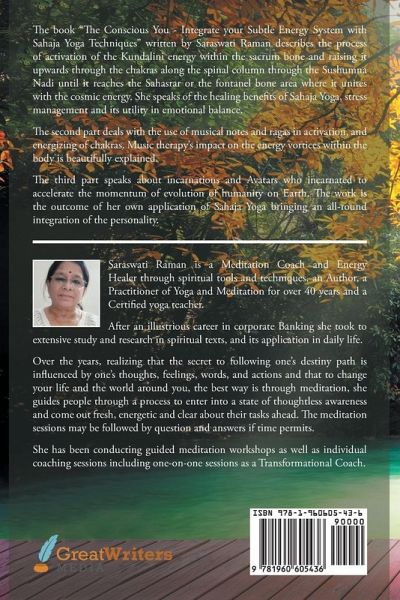 The book "The Conscious You - Integrate your Subtle Energy System with Sahaja Yoga Techniques" written by Saraswati Raman describes the process of activation of the Kundalini energy within the sacrum bone and raising it upwards through the chakras along the spinal column through the Sushumna Nadi until it reaches the Sahasrar or the fontanel bone area where it unites with the cosmic energy. She speaks of the healing benefits of Sahaja Yoga, stress management and its utility in emotional balance.The second part deals with the use of musical notes and ragas in activation, and energizing of chakras. Music therapy's impact on the energy vortices within the body is beautifully explained.The third part speaks about incarnations and Avatars who incarnated to accelerate the momentum of evolution of humanity on Earth. The work is the outcome of her own application of Sahaja Yoga bringing an all-round integration of the personality.
