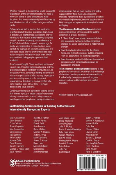 s Rules of Order for Groups, Organizations and Ad Hoc Assemblies that Want to Operate by Consensus - Lawrence Susskind PART TWO: HOW TO BULID CONSENSUS Choosing Appropriate Consensus Building Techniques and Strategies - Susan Carpenter Conducting a Conflict Assessment - Lawrence Susskind and Jennifer Thomas-Larmer Designing a Consensus Building Process using a Graphic Road Map - David A Straus Convening - Chris Carlson The Role of Facilitators, Mediators, and Other Consensus Building Practitioners - Michael Elliot Representation of Stakeholding Interests - David Laws Managing Meetings to Build Consensus - David A Straus Producing Consensus - Sarah McKearnan and David Fairman Joint Fact-Finding and the Use of Technical Experts - John R Ehrmann and Barbara L Stinson Making the Best Use of Technology - Connie P Ozawa Dealing with the Press - James E Kunde Dealing with Deep Value Differences - John Forester Legal Issues in Consensus Building - Dwight Golann and Eric E Van Loon Implementing Consenus-Based Agreements - William R Potapchuk and Jarle Crocker Visioning - Carl M Moore, Gianni Longo and Patsy Palmer Collaborative Problem Solving within Organizations - Christopher W Moore and Peter Woodrow Evaluating Consensus Building - Judith E Innes PART THREE: CASES AND COMMENTARIES Introduction to the Cases and Commentaries - Michèle Ferenz Activating a Policy Network - Peter Driessen The Case of Mainport Schipol The Northern Oxford County Coalition - Sarah McKearnan and Patrick Field Four Maine Towns Tackle a Public Health Mystery The Chelsea Charter Consensus Process - Susan L Podziba Affordable Housing Mediation - Lawrence Susskind and Susan L Podziba Building Consensus for Regional Agreements in the Hartford Area San Francisco Estuary Project - Judith E Innes and Sarah Connick Resolving Science-Intensive Public Policy Disputes - Scott McCreary Reflections on the New York Bight Initiative Negotiating Superfund Cleanup at the Massachusetts Military Reservation - Edward Scher RuleNet - Michèle Ferenz and Colin Rule An Experiment in On-Line Consensus Building Regulatory Negotiations - Jan Jung-Min Sunoo and Juliette A Falkner The Native American Experience Cross-Cultural Community-Based Planning - Norman Dale Negotiating the Future of the Haida Gwaii (British Columbia) The Chattanooga Process - John Parr A City