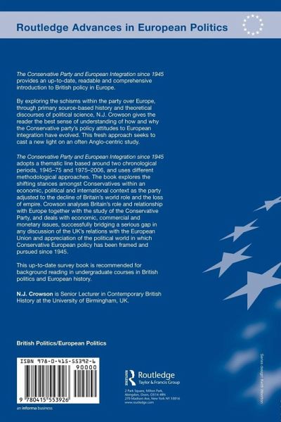 This volume provides an up-to-date and comprehensive introduction to British policy in Europe. By exploring the schisms within the party over Europe, through primary source-based history and theoretical discourses of political science, N.J. Crowson gives the reader the best sense of understanding of how and why the Conservative party's policy attitudes to European integration have evolved. The Conservative Party and European Integration since 1945 adopts a thematic line based around two chronological periods, 1945-75 and 1975-2006, and uses different methodological approaches. It explores the shifting stances amongst Conservatives within an economic, political and international context as the party adjusted to the decline of Britain's world role and the loss of empire. Crowson analyzes Britain's role and relationship with Europe together with the study of the Conservative Party, and deals with economic, commercial and monetary issues, successfully bridging a serious gap in any discussion of the UK's relations with the European Union and appreciation of the political world in which Conservative European policy has been framed and pursued since 1945. This book is recommended for background reading in undergraduate courses in British politics and European history.