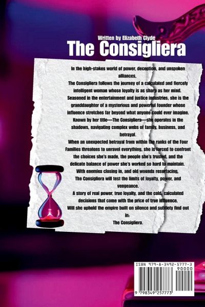 In the high-stakes world of power, deception, and unspoken alliances, The Consigliera follows the journey of a calculated and fiercely intelligent woman whose loyalty is as sharp as her mind. Seasoned in the entertainment and justice industries, she is the granddaughter of a mysterious and powerful founder whose influence stretches far beyond what anyone could ever imagine. Known by her title-The Consigliera-she operates in the shadows, navigating complex webs of family, business, and betrayal. When an unexpected betrayal from within the ranks of the Four Families threatens to unravel everything, she is forced to confront the choices she's made, the people she's trusted, and the delicate balance of power she's worked so hard to maintain. With enemies closing in, and old wounds resurfacing, The Consigliera will test the limits of loyalty, power, and vengeance. A story of real power, true loyalty, and the cold, calculated decisions that come with the price of true influence. Will she uphold the empire built on silence and subtlety find out in: The Consigliera.