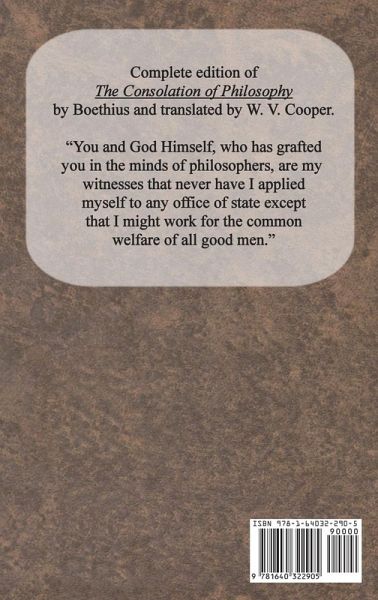 Complete edition of The Consolation of Philosophy by Boethius and translated by W. V. Cooper. As Boethius approached death, he contemplates what is happiness, purpose, and definition of a 'good' life. Insightful thinking for all time. To assist with understanding the middle English text, many words have been translated in the footnotes. "You and God Himself, who has grafted you in the minds of philosophers, are my witnesses that never have I applied myself to any office of state except that I might work for the common welfare of all good men." All students of thought should get this historic book. This 1902 edition is provided in a slim volume with full text at an affordable price.