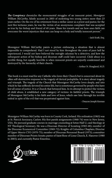 The Conspiracy chronicles the monumental struggles of an innocent priest, Monsignor William McCarthy, falsely accused in 2003 of molesting two young sisters more than 23 years earlier. On the eve of his retirement from a stellar career as a priest and pastor, for the next five tortuous years, he was the victim of an anonymous complaint that was accepted as true by his bishop and friend of 40 years. Share his travails and see how ones faith can overcome the worst injustices that man can heap on a holy and totally innocent person." - Jack Kraft, Esq. Monsignor William McCarthy paints a picture embracing a situation that is almost impossible to comprehend. Had I not stood by him throughout the years of pure hell he experienced, I would not have believed the outright calumny by a detective, and how the subsequent action of his bishop and diocesan staff could have occurred. Child abuse is a terrible thing, but equally horrible is when innocent priests are unjustly condemned and destroyed by the hierarchy of their church. - Arthur N. Hoagland, M.D. This book is a must read for any Catholic who loves their Church but is concerned about its often self-destructive response to the tragedy of clerical pedophilia. It is story about tragedy and triumph. The tragedy of the Church that Monsignor McCarthy loves deeply, and into which he has selflessly devoted his entire life, but is sometimes governed by people who have lost all sense of justice. It is a Church that betrayed him. In its attempt to protect the victims of child abuse, it established a new category of victims: its faithful priests. The triumph of Monsignor McCarthy is his faith and love of Jesus, which saw him through his terrible ordeal in spite of the evil that was perpetrated against him. - Deacon Joseph Keenan