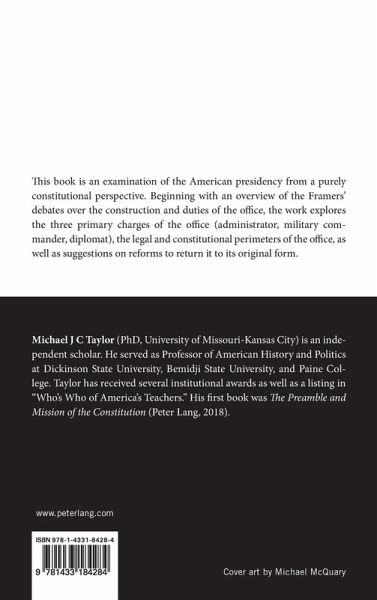 Michael J C Taylor (PhD, University of Missouri-Kansas City) is an independent scholar. He served as Professor of American History and Politics at Dickinson State University, Bemidji State University, and Paine College. Taylor has received several institutional awards as well as a listing in ¿Who¿s Who of Americäs Teachers.¿ His first book was The Preamble and Mission of the Constitution (Peter Lang, 2018).