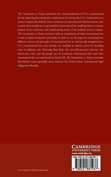 The Constitution as Treaty transforms the conceptualization of US constitutional law by exploring the interpretive implications of viewing the US Constitution as a treaty. It argues that federal courts constitute an international tribunal system, and, as such, their jurisdiction is governed by international law enabling them to exercise judicial review authority and undercutting much of the judicial activist critique. The Constitution as Treaty continues with an examination of what is international law and its major interpretive principles in order to set the stage for examining how different sources and principles of international law are intrinsically integrated into US constitutional law and, thereby, are available to federal courts for deciding cases. It addresses the Charming Betsy Rule, the non-self-execution doctrine, the last-in-time rule, and the proper use of customary international law and other international law sources not mentioned in Article III. The Constitution as Treaty concludes that federal courts generally must construe the United States' international legal obligations liberally.