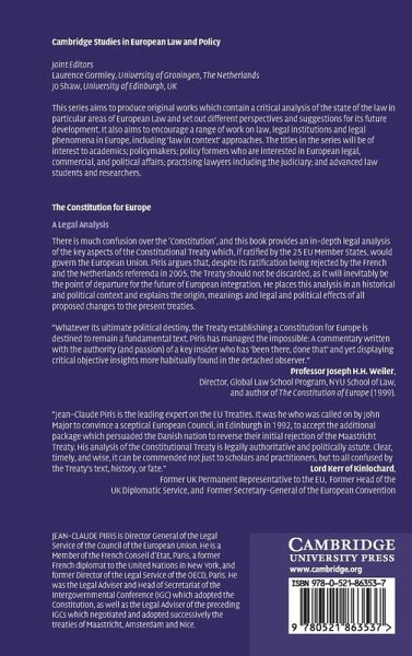 'Whatever its ultimate political destiny, the Treaty establishing a Constitution for Europe is destined to remain a fundamental text. Piris has managed the impossible: a commentary written with the authority (and passion) of a key insider who has 'been there, done that' and yet displaying critical objective insights more habitually found in the detached observer.' Joseph H. H. Weiler, Director, Global Law School Program, NYU School of Law