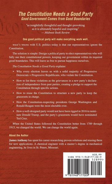 One good political party will make everything work well. What's wrong with U.S. politics today is that our representatives ignore the Constitution. The solution is simple: Design a political party to elect representatives who will fully use their constitutional powers, keeping government within its required good boundaries. This will leave us free to pursue happiness ourselves. The Constitution Needs a Good Party explains: Why every election leaves us with a solid majority of Progressive Democrats + Progressive Republicans, who violate the Constitution. How to list these violations as the grievances in a new party's declaration of independence from past parties, creating a pledge to support the Constitution through specific actions. How to reuse the Constitution to structure a new party to keep the grassroots in charge. How the Constitution-respecting presidents George Washington and Ronald Reagan were the most electable ever. How a well-designed party would not have been rigged in 2016 to nominate Donald Trump, and the party's grassroots would have nominated Ted Cruz. When the United States followed the Constitution better from 1789 through 1913, we changed the world. We can change the world again.