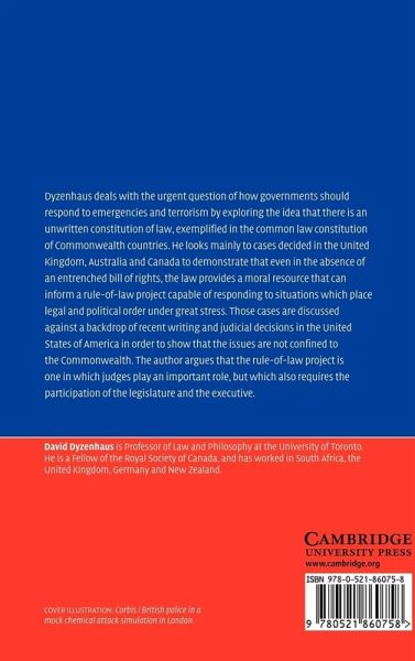 Dyzenhaus deals with the urgent question of how governments should respond to emergencies and terrorism by exploring the idea that there is an unwritten constitution of law, exemplified in the common law constitution of Commonwealth countries. He looks mainly to cases decided in the United Kingdom, Australia and Canada to demonstrate that even in the absence of an entrenched bill of rights, the law provides a moral resource that can inform a rule-of-law project capable of responding to situations which place legal and political order under great stress. Those cases are discussed against a backdrop of recent writing and judicial decisions in the United States of America in order to show that the issues are not confined to the Commonwealth. The author argues that the rule-of-law project is one in which judges play an important role, but which also requires the participation of the legislature and the executive.