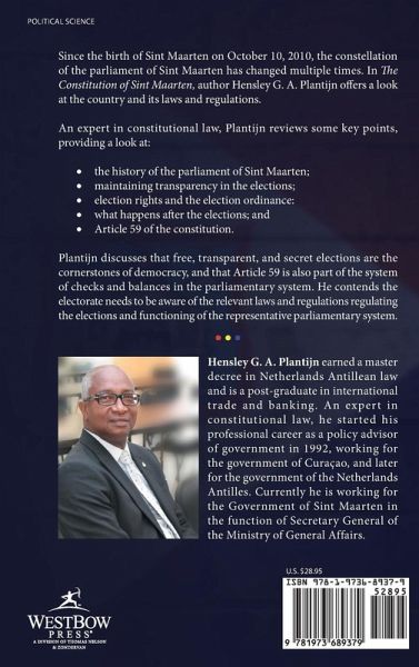 Since the birth of Sint Maarten on October 10, 2010, the constellation of the parliament of Sint Maarten has changed multiple times. In The Constitution of Sint Maarten, author Hensley G. A. Plantijn offers a look at the country and its laws and regulations. An expert in constitutional law, Plantijn reviews some key points, providing a look at: ¿ the history of the parliament of Sint Maarten; ¿ maintaining transparency in the elections; ¿ election rights and the election ordinance: ¿ what happens after the elections; and ¿ Article 59 of the constitution. Plantijn discusses that free, transparent, and secret elections are the cornerstones of democracy, and that Article 59 is also part of the system of checks and balances in the parliamentary system. He contends the electorate needs to be aware of the relevant laws and regulations regulating the elections and functioning of the representative parliamentary system.