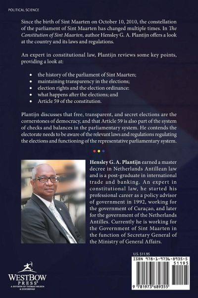 Since the birth of Sint Maarten on October 10, 2010, the constellation of the parliament of Sint Maarten has changed multiple times. In The Constitution of Sint Maarten, author Hensley G. A. Plantijn offers a look at the country and its laws and regulations. An expert in constitutional law, Plantijn reviews some key points, providing a look at: ¿ the history of the parliament of Sint Maarten; ¿ maintaining transparency in the elections; ¿ election rights and the election ordinance: ¿ what happens after the elections; and ¿ Article 59 of the constitution. Plantijn discusses that free, transparent, and secret elections are the cornerstones of democracy, and that Article 59 is also part of the system of checks and balances in the parliamentary system. He contends the electorate needs to be aware of the relevant laws and regulations regulating the elections and functioning of the representative parliamentary system.