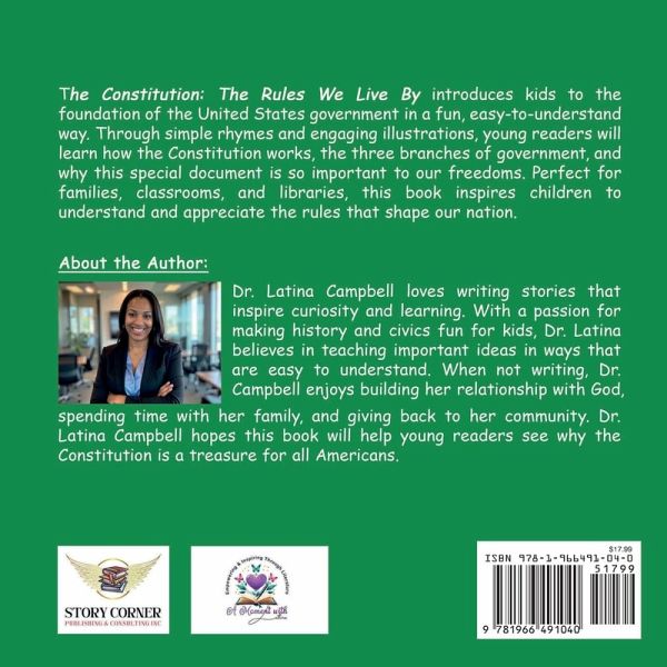 The Constitution: The Rules We Live By introduces kids to the foundation of the United States government in a fun, easy-to-understand way. Through simple rhymes and engaging illustrations, young readers will learn how the Constitution works, the three branches of government, and why this special document is so important to our freedoms. Perfect for families, classrooms, and libraries, this book inspires children to understand and appreciate the rules that shape our nation. About the Author: Dr. Latina Campbell loves writing stories that inspire curiosity and learning. With a passion for making history and civics fun for kids, Dr. Latina believes in teaching important ideas in ways that are easy to understand. When not writing, Dr. Campbell enjoys building her relationship with God, spending time with her family, and giving back to her community. Dr. Latina Campbell hopes this book will help young readers see why the Constitution is a treasure for all Americans.