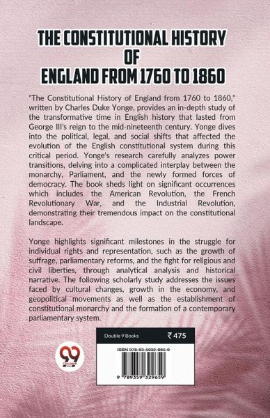 "The Constitutional History of England from 1760 to 1860," written by Charles Duke Yonge, provides an in-depth study of the transformative time in English history that lasted from George III's reign to the mid-nineteenth century. Yonge dives into the political, legal, and social shifts that affected the evolution of the English constitutional system during this critical period. Yonge's research carefully analyzes power transitions, delving into a complicated interplay between the monarchy, Parliament, and the newly formed forces of democracy. The book sheds light on significant occurrences which includes the American Revolution, the French Revolutionary War, and the Industrial Revolution, demonstrating their tremendous impact on the constitutional landscape. Yonge highlights significant milestones in the struggle for individual rights and representation, such as the growth of suffrage, parliamentary reforms, and the fight for religious and civil liberties, through analytical analysis and historical narrative. The following scholarly study addresses the issues faced by cultural changes, growth in the economy, and geopolitical movements as well as the establishment of constitutional monarchy and the formation of a contemporary parliamentary system.