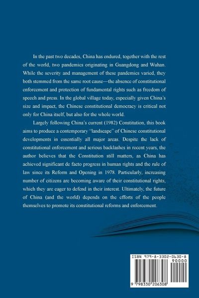 In the past two decades, China has endured, together with the rest of the world, two pandemics originating in Guangdong and Wuhan. While the severity and management of these pandemics varied, they both stemmed from the same root cause-the absence of constitutional enforcement and protection of fundamental rights such as freedom of speech and press. In the global village today, especially given China's size and impact, the Chinese constitutional democracy is critical not only for China itself, but also for the whole world. Largely following China's current (1982) Constitution, this book aims to produce a contemporary "landscape" of Chinese constitutional developments in essentially all major areas. Despite the lack of constitutional enforcement and serious backlashes in recent years, the author believes that the Constitution still matters, as China has achieved significant de facto progress in human rights and the rule of law since its Reform and Opening in 1978. Particularly, increasing number of citizens are becoming aware of their constitutional rights, which they are eager to defend in their interest. Ultimately, the future of China (and the world) depends on the efforts of the people themselves to promote its constitutional reforms and enforcement