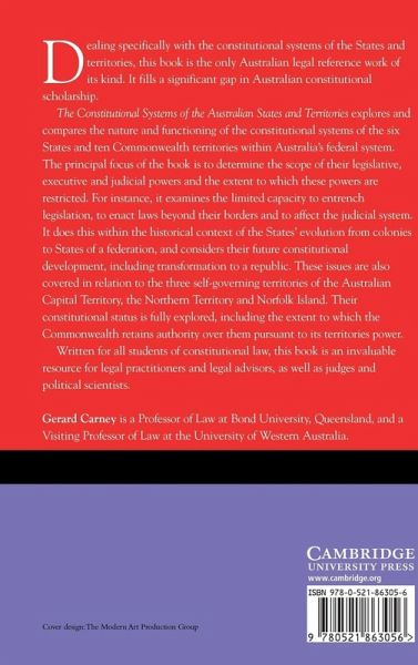 This book outlines the constitutional systems of the six Australian states and ten Commonwealth territories. It begins with their history, basic features, role and future within the Australian federation. Its primary focus is on the binding constitutional restrictions which impact on their parliaments and governments. These issues are also dealt with in relation to the three self-governing territories of the ACT, the Northern Territory and Norfolk Island. It is the only Australian legal reference work of its kind which deals specifically with the constitutional systems of the states and territories. This book is for all law students and constitutional law teachers as well as legal advisors to commonwealth, state and territory governments and parliaments. It will also be of interest to Supreme, Federal, and High Court judges, political scientists working in the area of federalism and anyone with an interest in constitutional affairs.