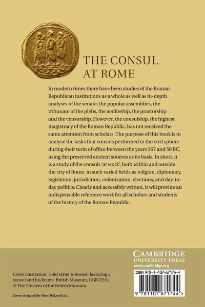 In modern times there have been studies of the Roman Republican institutions as a whole as well as in-depth analyses of the senate, the popular assemblies, the tribunate of the plebs, the aedileship, the praetorship and the censorship. However, the consulship, the highest magistracy of the Roman Republic, has not received the same attention from scholars. The purpose of this book is to analyse the tasks that consuls performed in the civil sphere during their term of office between the years 367 and 50 BC, using the preserved ancient sources as its basis. In short, it is a study of the consuls 'at work', both within and outside the city of Rome, in such varied fields as religion, diplomacy, legislation, jurisdiction, colonisation, elections, and day-to-day politics. Clearly and accessibly written, it will provide an indispensable reference work for all scholars and students of the history of the Roman Republic.