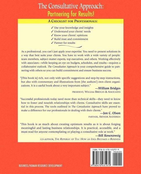 As a professional, you can't just apply your expertise. You need to present solutions in a way that best suits your clients. You have to work with a wide variety of people: team members, subject matter experts, top executives, and others. Working effectively with associates--while keeping an eye on budgets, schedules, and results--requires a collaborative outlook."Successful professionals today need more than technical skills-- they need to know how to foster and nourish relationships with clients. Consultative skills are essential in this process. The tools outlined in The Consultative Approach have proved to make a difference for our professionals in dealing with their clients." > "This book is rich, not only with specific suggestions and step-by-step instructions, but also with commentary and illustrations from [the authors'] own client organizations. It is a useful book about a very important subject." > Working consultatively enables you to: * Know how to work effectively with all types of people * Use a strategic and collaborative communcation process * Apply your expertise in ways that show your value . . . and more! The Consultative Approach is a how-to handbook that will enable you to reap the benefits of partnering. You'll find informative case studies, easy-to-use assessment tools, enlightening exercises, and practical worksheets. Plus, you'll get flow chart planning guides and a partnering strategy action plan that will enable you to chart your communication growth. The Consultative Approach has it all! Plot your path to consultative success with this comprehensive guidebook.