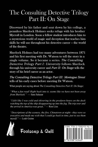 Disowned by his father and sent down by his college, a penniless Sherlock Holmes seeks refuge with his brother Mycroft in London. Soon a fellow student introduces him to a mysterious world of magic and deception which will teach him skills he will use throughout his detective career -- the world of the theater.Kidnappers and a murderous attack at the stage door in London, police corruption in New York, train robbers in Nebraska, and hoodlums and shanghaiers in San Francisco are among the many challenges young Sherlock Holmes faces.
