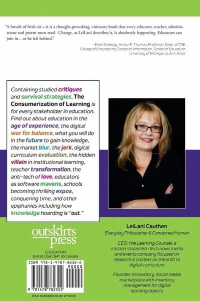 It is time to go "all-in" with the digital transition and realize its true end-point Containing studied critiques and survival strategies, The Consumerization of Learning is a distillation of knowledge from the author's epic road trip to every major U.S. city. This is a book for educational leaders, teachers and parents as well as curriculum publishers. Find out about schools in the Age of Experience, the digital war for balance, what the future you will do to gain knowledge, the market blur, the jerk, digital curriculum evaluation, the hidden villain in institutional learning, teacher transformation, the anti-tech of Love, educators as software mavens, schools becoming thrilling Expos, conquering time, and other epiphanies. Chapters include: Conquering Time The Grand Scheme A Model Architecture for Schools The Characteristics of Digital Curriculum Evaluating Digital Curriculum Un-gating Potential and Rigor Love, the Anti-Tech Paying for It This is a deep dive into the disruption at hand for the way leaders lead education digitally. It highlights consumerization as the act of making something desirable and consumable by the individual. If schools fully discover and adapt to consumerization's ingenuity, it has the power to give teachers back time spent custom building every digital resource themselves-time that can now be turned to attention on students, to create more hands-on learning activities, and to guide students in the fullness of a digital learning experience. Read this book and be part of the discussion about how schools are finding a new relevancy at the natural end-point of digital transition: maximized live experience and quality digital learning, also known as "expo" education. Leaders in Education Praise The Consumerization of Learning "The creators of Amazon know the future of retail is direct to consumer. The founders of Uber know the future of transportation is on-demand. The visionary at Tesla understands that the future of energy creation and storage is distributed. LeiLani Cauthen knows the future of Education shares all three of these characteristics. In The Consumerization of Learning she shares her expansive knowledge of what it all means." -Erik Heinrich Former IT Director, San Francisco Unified School District "A breath of fresh air - it is a thought-provoking, visionary book that every educator, teacher, administrator and parent must read. Change, as LeiLani describes it, is absolutely happening. Educators can join in... or be left behind." - Dr. Elliot Soloway School of Education, University of Michigan at Ann Arbor "LeiLani has been asking essential questions as she investigates the educational system across the United States. In approaching trends and gaps from a business lens, she is able to highlight areas that may seem obvious after she points them out but may have gone largely unnoticed or unconsidered from an education focused lens. In the three years of knowing LeiLani, I've gained new insight and perspective shifts, learned about broader trends, gaps and predictions for future movement in digital content and strategy, and been able to fit together puzzle pieces I didn't know I was missing before. She has a forward thinking vision for the future of education, paradigm shifts, organizational shifts, with students at the center." - Dr. Michelle Zimmerman 2016 NCCE Outstanding Technology Educator of the Year, Microsoft Innovative Education Expert at Microsoft Education Teacher/Researcher, Renton Preparatory Academy