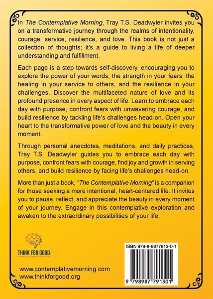 This book is a guide to understanding and embracing the profound themes that shape our lives, from the words we speak to the love we share. Each page is designed to offer insights and practices that encourage reflection, growth, and connection. As you turn these pages, you'll be embarking on a path of self-discovery, learning to navigate life with intentionality, courage, service, resilience, and love: Intentionality: Considering the impact of our words and actions. Being mindful and deliberate in how you interact with others, recognizing that even small gestures or words can have a significant impact on those around you. Courage: Courage: You are encouraged to face and overcome your fears, especially those related to seeking approval or validation from others. This section challenges you to find your inner strength and to act bravely, even when you feel uncertain or intimidated. Service: The healing and transformative power of serving others. This section emphasizes the healing and transformative power of helping others. By engaging in acts of kindness and compassion, you can experience personal growth and fulfillment, and foster a deeper sense of connection with your community. Resilience: Recognizing the role of challenges in personal growth-viewing all challenges and obstacles as opportunities for personal growth. This section encourages you to see difficulties not as setbacks, but as chances to learn and develop, highlighting the importance of recovering and emerging stronger from tough situations. Love: Exploring the various forms and expressions of love, from romantic relationships to self-love, and the love found in acts of forgiveness and compassion. You are invited to open your heart to experiencing and recognizing love in its many forms in your life. Consider this book as a daily companion designed to enrich your journey toward a more intentional and fulfilling life. Here's how to make the most of this book: Start Each Day with Purpose: Embrace each morning with a passage from "The Contemplative Morning." Let these insights be the backdrop of your day, infusing each moment with mindfulness and intent. Dive into Deep Reflection: At the close of each insight, you'll encounter thought-provoking inquiries. These are not just questions, but gateways to deeper self-awareness. Whether through meditation, journaling, or quiet reflection, engage with these inquiries to uncover layers of your inner self. Actionable Daily Steps: Every insight is paired with a practical action. These steps are your toolkit for weaving the day's wisdom into the fabric of your everyday life. From small acts of kindness to moments of courage, these practices are your pathway to personal evolution. Journal Your Journey: Accompany your reading with a personal journal. Document your thoughts, emotions, and revelations to chronicle your growth. Reflect, Revisit, and Grow: Regular introspection is key. Revisit the insights and lessons you've absorbed. Each rereading can unveil fresh perspectives, adapting as you grow in your journey. Share Your Insights: Consider this book a conversation starter. Discuss your discoveries in group settings or with a partner. Sharing not only deepens your understanding but also creates bonds of shared growth and understanding.