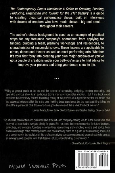 The Contemporary Circus Handbook: A Guide to Creating, Funding, Producing, Organizing and Touring for the 21st Century is a guide to creating theatrical performance shows, built on interviews with dozens of creators who have made shows-big and small-throughout their careers. The author's circus background is used as an example to practical steps for any freelance company's operations: from applying for funding, building a team, planning workshops and residencies, to characteristics of successful shows. These lessons are applicable to circus, dance and theater as well as most performing arts. Whether it's your first foray into creating your own major endeavor-or you've got a couple of creations under your belt-you're sure to find advice to improve your process and bring your dream show to life. Includes a foreword by Shana Carroll, co-founder of Les 7 doigts de la main (The Seven Fingers).