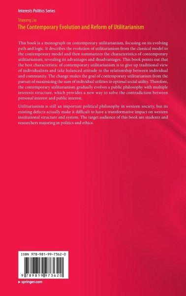 This book is a monograph on contemporary utilitarianism, focusing on its evolving path and logic. It describes the evolution of utilitarianism from the classical model to the contemporary model and then summarizes the characteristics of contemporary utilitarianism, revealing its advantages and disadvantages. This book points out that the best characteristic of contemporary utilitarianism is to give up traditional view of individualism and take balanced attitude to the relationship between individual and community. The change makes the goal of contemporary utilitarianism from the pursuit of maximizing the sum of individual utilities to optimal social utility. Therefore, the contemporary utilitarianism gradually evolves a public philosophy with multiple interests structure, which provides a new way to solve the contradiction between personal interest and public interest.