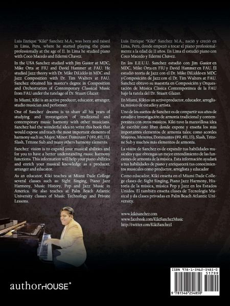 The purpose of this book is to share Sanchezs years of studying of traditional and contemporary music harmony with other musicians and students. Sanchez had the wonderful idea to write this book that would expose and teach the most important elements of harmony such as major, minor, dominant 7 (9, 11, and 13), slash, tritone sub, and many others harmony elements. Sanchezs vision is to expand your musical abilities and for you to have a better understanding of music harmony functions. This information will help your piano abilities and enrich your musical knowledge as a producer, arranger, and educator. El propsito de este libro es de compartir los aos de estudio de Sanchez relacionados a la armona tradicional y contempornea con otros msicos y estudiantes. Sanchez tuvo la maravillosa idea de escribir este libro que expone y ensea los ms importantes elementos de la armona, tales como: acordes Mayores, Menores, Dominantes 7 (9, 11 y 13), Slash, Tritone Sub y muchos ms elementos de la armona. La visin de Sanchez es expandir tus habilidades musicales y para que tengas una mejor comprensin de cmo funciona la armona en la msica. Esta informacin ayudar en tus habilidades de piano y enriquecer tus conocimientos musicales como productor, arreglista y educador.