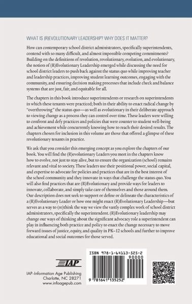 How can contemporary school district administrators, specifically superintendents, contend with so many difficult, and almost impossible competing commitments? Building on the definitions of revolution, revolutionary, evolution, and evolutionary, the notion of (R)Evolutionary Leadership emerged while discussing the need for school district leaders to push back against the status quo while improving teacher and leadership practices, improving student learning outcomes, engaging with the community, and ensuring decision making processes that include check and balance systems that are just, fair, and equitable for all. The chapters in this book introduce superintendents or research on superintendents in which these tenants were practiced;both in their ability to enact radical change by "overthrowing" the status quo - as well as evolutionary in their deliberate approach to viewing change as a process they can control over time. These leaders were willing to confront and defy practices and policies that were counter to student well-being and achievement while concurrently knowing how to reach their desired results. The chapters chosen for inclusion in this volume are those that offered a glimpse of these revolutionary tenants in practice. We ask that you consider this emerging concept as you explore the chapters of our book. You will find the (R)evolutionary Leaders you meet in the chapters know how to evolve, not just to stay alive, but to ensure the organization (school) remains relevant and vital to society. These leaders use their positional power, social capital, and expertise to advocate for policies and practices that are in the best interest of the school community and they innovate in ways that challenge the status quo. You will also find practices that are (R)Evolutionary and provide ways for leaders to innovate, collaborate, and simply take care of themselves and those around them. Our description does not seek to support or define or delineate the characteristics of a (R)Evolutionary Leader or how one might enact (R)Evolutionary Leadership-but serves as a way to (re)think the way we view the vastly complex work of school district administrators, specifically the superintendent. (R)Evolutionary leadership may change our ways of thinking about the significant advocacy role a superintendent can play in influencing both practice and policy to enact the change necessary to move forward issues of justice, equity, and quality in PK-12 schools and further to improve educational and social outcomes for those served.