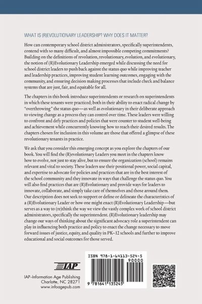 How can contemporary school district administrators, specifically superintendents, contend with so many difficult, and almost impossible competing commitments? Building on the definitions of revolution, revolutionary, evolution, and evolutionary, the notion of (R)Evolutionary Leadership emerged while discussing the need for school district leaders to push back against the status quo while improving teacher and leadership practices, improving student learning outcomes, engaging with the community, and ensuring decision making processes that include check and balance systems that are just, fair, and equitable for all. The chapters in this book introduce superintendents or research on superintendents in which these tenants were practiced; both in their ability to enact radical change by "overthrowing" the status quo - as well as evolutionary in their deliberate approach to viewing change as a process they can control over time. These leaders were willing to confront and defy practices and policies that were counter to student well-being and achievement while concurrently knowing how to reach their desired results. The chapters chosen for inclusion in this volume are those that offered a glimpse of these revolutionary tenants in practice. We ask that you consider this emerging concept as you explore the chapters of our book. You will find the (R)evolutionary Leaders you meet in the chapters know how to evolve, not just to stay alive, but to ensure the organization (school) remains relevant and vital to society. These leaders use their positional power, social capital, and expertise to advocate for policies and practices that are in the best interest of the school community and they innovate in ways that challenge the status quo. You will also find practices that are (R)Evolutionary and provide ways for leaders to innovate, collaborate, and simply take care of themselves and those around them. Our description does not seek to support or define or delineate the characteristics of a (R)Evolutionary Leader or how one might enact (R)Evolutionary Leadership-but serves as a way to (re)think the way we view the vastly complex work of school district administrators, specifically the superintendent. (R)Evolutionary leadership may change our ways of thinking about the significant advocacy role a superintendent can play in influencing both practice and policy to enact the change necessary to move forward issues of justice, equity, and quality in PK-12 schools and further to improve educational and social outcomes for those served.