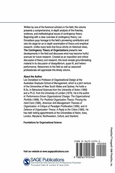 Written by one of the foremost scholars in the field, this volume presents a comprehensive, in-depth analysis of the theories, evidence and methodological issues of contingency theory - one of the major theoretical lenses used to view organizations. It includes both an appreciation of the coherency of contingency theory overall and a frank recognition of some of the deficiencies in contingency theory research. The coherent underlying model provides the platform from which to make good some of the deficiencies through a series of improvements in theory and method that chart the course for future research. The opening chapter presents a theoretical integration to provide the reader with an overview that makes sense of what is a large literature. It also argues that there is an underlying core paradigm that renders contingency theory coherent. The next chapters lay out the foundations of contingency theory by reviewing the pioneering contributors to theory and empirical research. This is followed by an examination of the causal models in the received bureaucracy research literature and an attempt to put them on a more truly contingency theory base. Chapters 7 and 8 examine in detail the concept of fit and its relationship with performance, including the empirical research studies. Chapter 9 presents possible new developments for contingency theory, to make it more coherent and, hopefully, valid. These new developments include the concepts of disequilibrium, quasi-fit and hetero-performance. All three are novel concepts that substantially revise and improve contingency theory. The final chapter offers suggestions on how to operationalize the ideas in this book in terms of hypotheses for future empirical research.