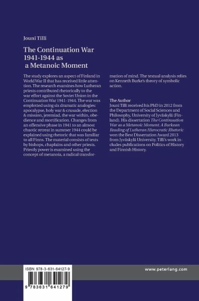 The study explores an aspect of Finland in World War II that has received little attention. The research examines how Lutheran priests contributed rhetorically to the war effort against the Soviet Union in the Continuation War 1941-1944. The war was emplotted using six dramatic analogies: apocalypse, holy war & crusade, election & mission, jeremiad, the war within, obedience and mortification. Changes from an offensive phase in 1941 to an almost chaotic retreat in summer 1944 could be explained using rhetoric that was familiar to all Finns. The material consists of texts by bishops, chaplains and other priests. Priestly power is examined using the concept of metanoia, a radical transformation of mind. The textual analysis relies on Kenneth Burke's theory of symbolic action.