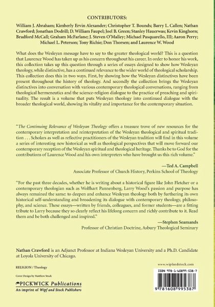 What does the Wesleyan message have to say to the greater theological world? This is a question that Laurence Wood has taken up as his concern throughout his career. In order to honor his work, this collection takes up this question through a series of essays designed to show how Wesleyan Theology, while distinctive, has a continued relevance to the wider world of theological scholarship. This collection does this in two ways. First, by showing how the Wesleyan distinctives have been present throughout the history of theology. And secondly, the collection brings the Wesleyan distinctives into conversation with various contemporary theological conversations, ranging from theological hermeneutics and the science-religion dialogue to the practice of preaching and spirituality. The result is a volume that puts Wesleyan theology into continued dialogue with the broader theological world, showing its vitality and importance for the contemporary situation. ""The Continuing Relevance of Wesleyan Theology offers a treasure trove of new resources for the contemporary interpretation and reinterpretation of the Wesleyan theological and spiritual tradition . . . Scholars as well as reflective practitioners of the Wesleyan tradition will find in this volume a series of interesting new historical as well as theological perspectives that will move forward our contemporary reception of the Wesleyan spiritual and theological heritage. Thanks be to God for the contributions of Laurence Wood and his own interpreters who have brought us this rich volume."" -Ted A. Campbell Associate Professor of Church History Perkins School of Theology ""For the past three decades, whether he is writing about a historical figure like John Fletcher or a contemporary theologian such as Wolfhart Pannenberg, Larry Wood's passion and purpose has always remained the same: to deepen and enhance Wesleyan theology both by furthering its own historical self-understanding and broadening its dialogue with contemporary theology, philosophy, and science. These essays-written by friends, colleagues, and former students-are a fitting tribute to Larry because they so clearly reflect his lifelong concern and richly contribute to it. Read them and be both challenged and inspired. -Stephen Seamands Professor of Christian Doctrine Asbury Theological Seminary CONTRIBUTORS: William J. Abraham Kimberly Ervin Alexander Christopher T. Bounds Barry L. Callen Nathan Crawford Jonathan Dodrill D. William Faupel Joel B. Green Stanley Hauerwas Kevin Kinghorn Bradford McCall Graham McFarlane J. Steven O'Malley Michael Pasquarello, III Aaron Perry Michael L. Peterson Tony Richie Don Thorsen Laurence W. Wood Nathan Crawford is an Adjunct Professor at Indiana Wesleyan University and a Ph.D. Candidate at Loyola University of Chicago.