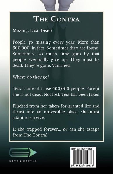 Missing. Lost. Dead? People go missing every year. More than 600,000, in fact. Sometimes they are found. Sometimes, so much time goes by that people eventually give up. They must be dead. They're gone. Vanished. Where do they go? Tess is one of those 600,000 people. Except she is not dead. Not lost. Tess has been taken. Plucked from her taken-for-granted life and thrust into an impossible place, she must adapt to survive. Is she trapped forever... or can she escape from The Contra?