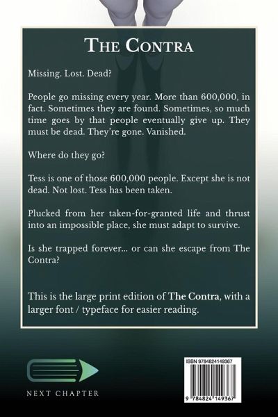 Missing. Lost. Dead? People go missing every year. More than 600,000, in fact. Sometimes they are found. Sometimes, so much time goes by that people eventually give up. They must be dead. They're gone. Vanished. Where do they go? Tess is one of those 600,000 people. Except she is not dead. Not lost. Tess has been taken. Plucked from her taken-for-granted life and thrust into an impossible place, she must adapt to survive. Is she trapped forever... or can she escape from The Contra? This is the large print edition of The Contra, with a larger font / typeface for easier reading.