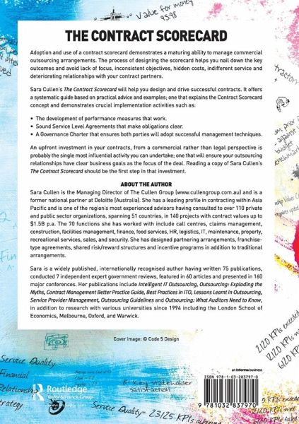 Contents: Foreword Preface Introduction The quadrants of the contract scorecard The steps in developing KPIs Schemes for the consequences of KPI performance Planning the contract scorecard The quality specification - the service level agreement (SLA) The financial specification - the financial schedule The relationship specification - the governance charter The strategic specification - unique contract schedules Conclusion References Index.