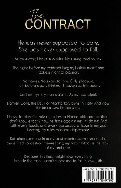 He was never supposed to care.She was never supposed to fall. As an escort, I have two rules: No kissing and no sex. The night before my contract begins, I allow myself one reckless night of passion. No names. No expectations. Only pleasure. I left before dawn, thinking I'll never see him again. Until my mystery man walks in. As my new client. Damien Wolfe, the Wolfe of Fifth Avenue, owns this city. And now, for two weeks, he owns me. I have to play the role of his loving Fiance while pretending I don't know exactly how he feels against me. Inside me. And with every touch, and every possessive whisper in my ear, keeping my rules becomes impossible. But when someone from my past resurfaces-someone who once tried to destroy me-keeping my heart intact is the least of my problems. Because this time, I might lose everything. Including the man I wasn't supposed to fall in love with.