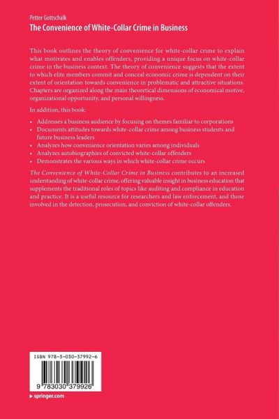 This book outlines the theory of convenience for white-collar crime to explain what motivates and enables offenders, providing a unique focus on white-collar crime in the business context. The theory of convenience suggests that the extent to which elite members commit and conceal economic crime is dependent on their extent of orientation towards convenience in problematic and attractive situations. Chapters are organized along the main theoretical dimensions of economical motive, organizational opportunity, and personal willingness.