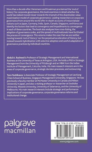 List of Tables List of Figures Notes on Contributors Convergence of Corporate Governance: Promise and Prospects; A.A.Rasheed T.Yoshikawa Reflections on the End of History for Corporate Law; H.Hansmann & R.Kraakman Does Convergence in Regulation Lead to Convergence in Practice? The Case of Dissident Proxy Contests in Canada; K.A.Bates & D.A.Hennessy Corporate Governance in Germany: Converging Towards Shareholder Value-Orientation or Not So Much?; A.Tuschke & M.Luber Corporate Governance in India: Progress, Problems, and Prospects; N.Rajagopalan & Y.Zhang Corporate Governance Convergence in Japan; C.L.Ahmadjian Transformation of Corporate Governance in Korea; H.Kim & Ji-H.Lee Converging Divergence in Corporate Governance in Singapore; L.S.Tsui-Auch A Decade of Corporate Governance Reforms in Spain (2000-2010); R.Garcia-Castro & R.V.Aguilera Globalization and Corporate Governance Convergence: The Multinational Corporations as a Neglected Agent of Convergence; K.Sikavica & T.Yoshikawa Are Codes Fostering Convergence in Corporate Governance? An Institutional Perspective; I.Haxhi & R.V.Aguilera Why Do Chinese Firms Cross-list in the United States?; M.W.Peng & D.P.Blevins