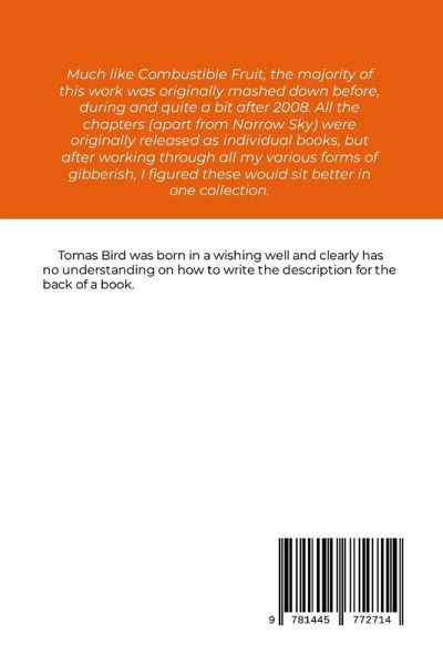 Much like Combustible Fruit, the majority of this work was originally mashed down before, during and quite a bit after 2008. All the chapters (apart from Narrow Sky) were originally released as individual books, but after working through all my various forms of gibberish, I figured these would sit better in one collection.