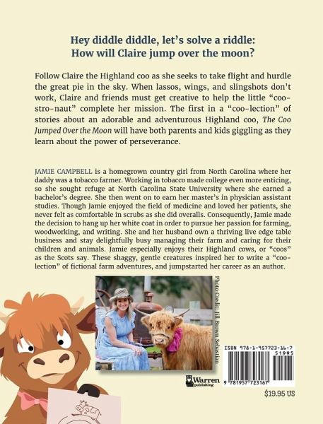 Hey diddle diddle, let's solve a riddle: how will Claire jump over the moon? Follow Claire the Highland coo as she seeks to take flight and hurdle the great pie in the sky. When lassos, wings, and slingshots don't work, Claire and friends must get creative to help the little "coo-stro-naut" complete her mission. The first in a "coo-lection" of stories about an adorable and adventurous Highland coo, The Coo Jumped Over the Moon will have both parents and kids giggling as they learn about the power of perseverance.